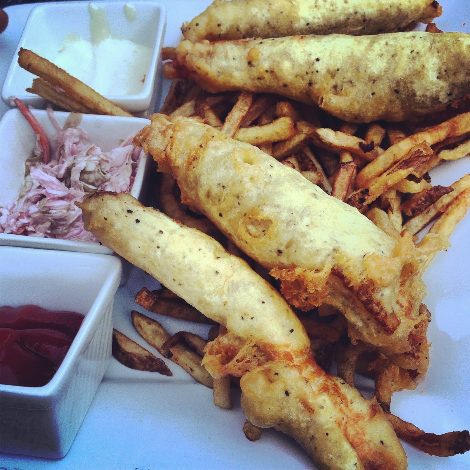 Chris got the fish and chips. Kind of an odd summer choice perhaps, but they were delicious never the less. Plus we can never leave a restaurant without getting a few fries at some point.